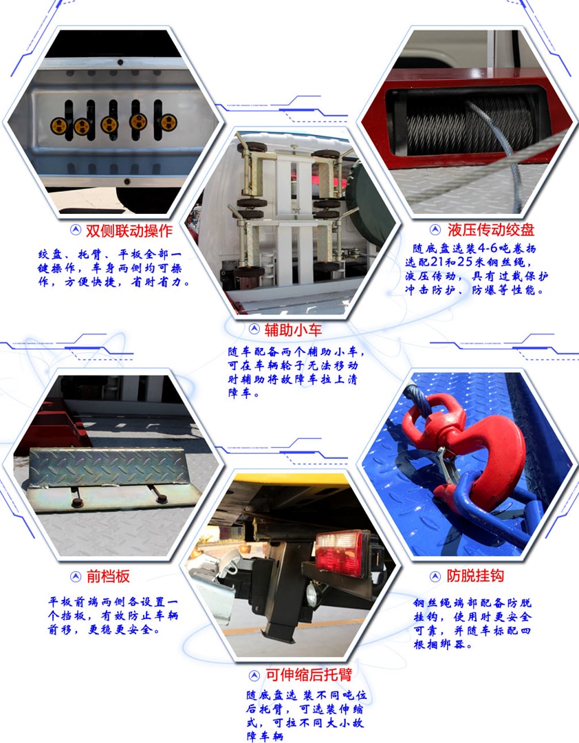 | 補(bǔ)充說明:特點(diǎn)1:多路閥、平衡閥采用意大利原裝進(jìn)口件(湖北唯一進(jìn)口液壓件的清障車)